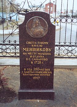 У церкви Покрова под 80-метровой Самаровской горой - обелиск в память кратковременного пребывания здесь светлейшего князя Меншикова в 1728 году: "В год 360-летия г. Ханты-Мансийска благодарные потомки. 1997". Тут все странно: город выходит на три столетия старше, чем на самом деле, и за что, спрашивается, благодарят светлейшего, которого Суриков придавил избяным потолком в полтысяче верст отсюда по прямой.